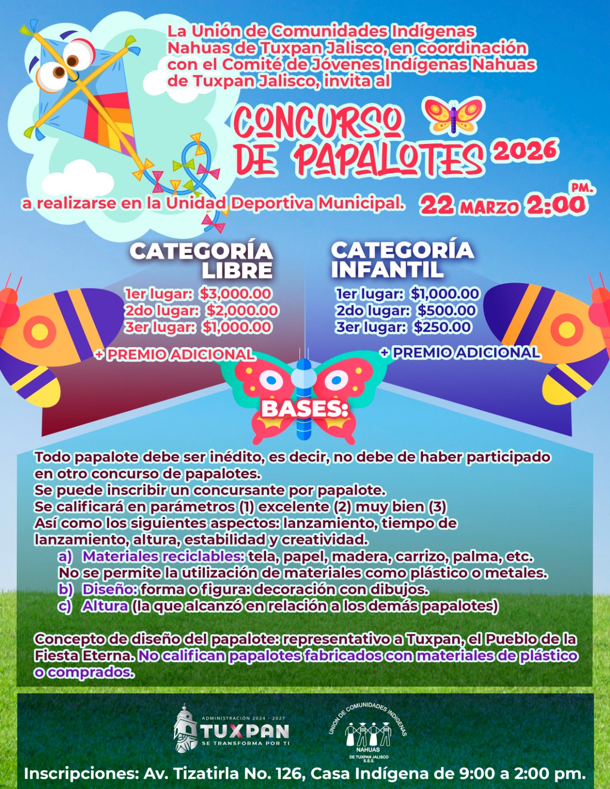 La Unión de Comunidades Indígenas Nahuas de Tuxpan Jalisco, en coordinación con el Comité de Jóvenes Indígenas Nahuas de Tuxpan Jalisco, invita al: Concurso de Papalotes