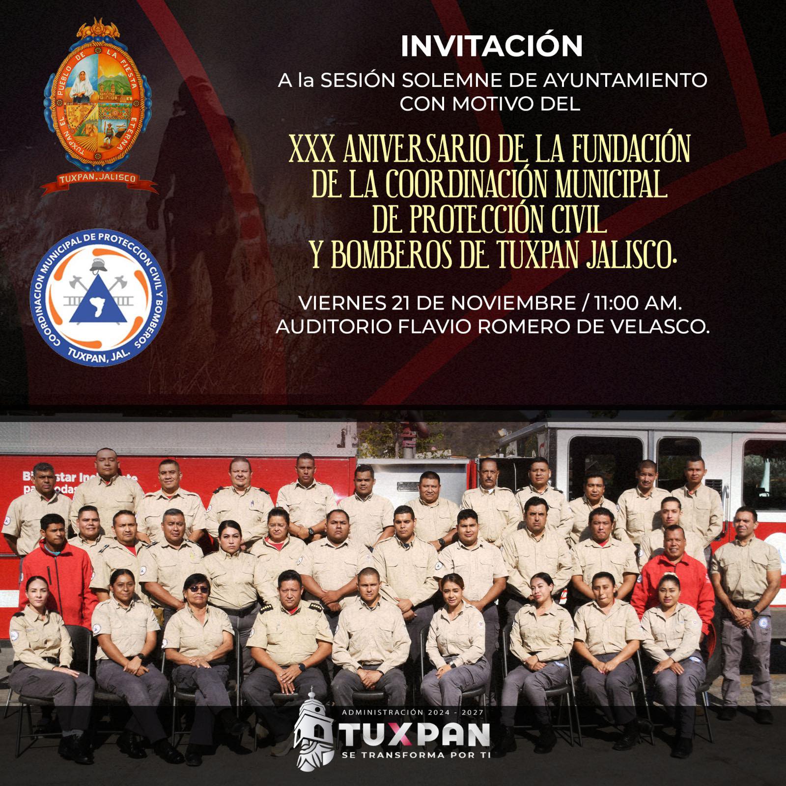 Viernes 21 de noviembre a las 11:00 a.m. en el Auditorio Flavio Romero de Velasco para conmemorar el XXX Aniversario de la Fundación de la Coordinación Municipal de Protección Civil y Bomberos de Tuxpan, Jalisco.