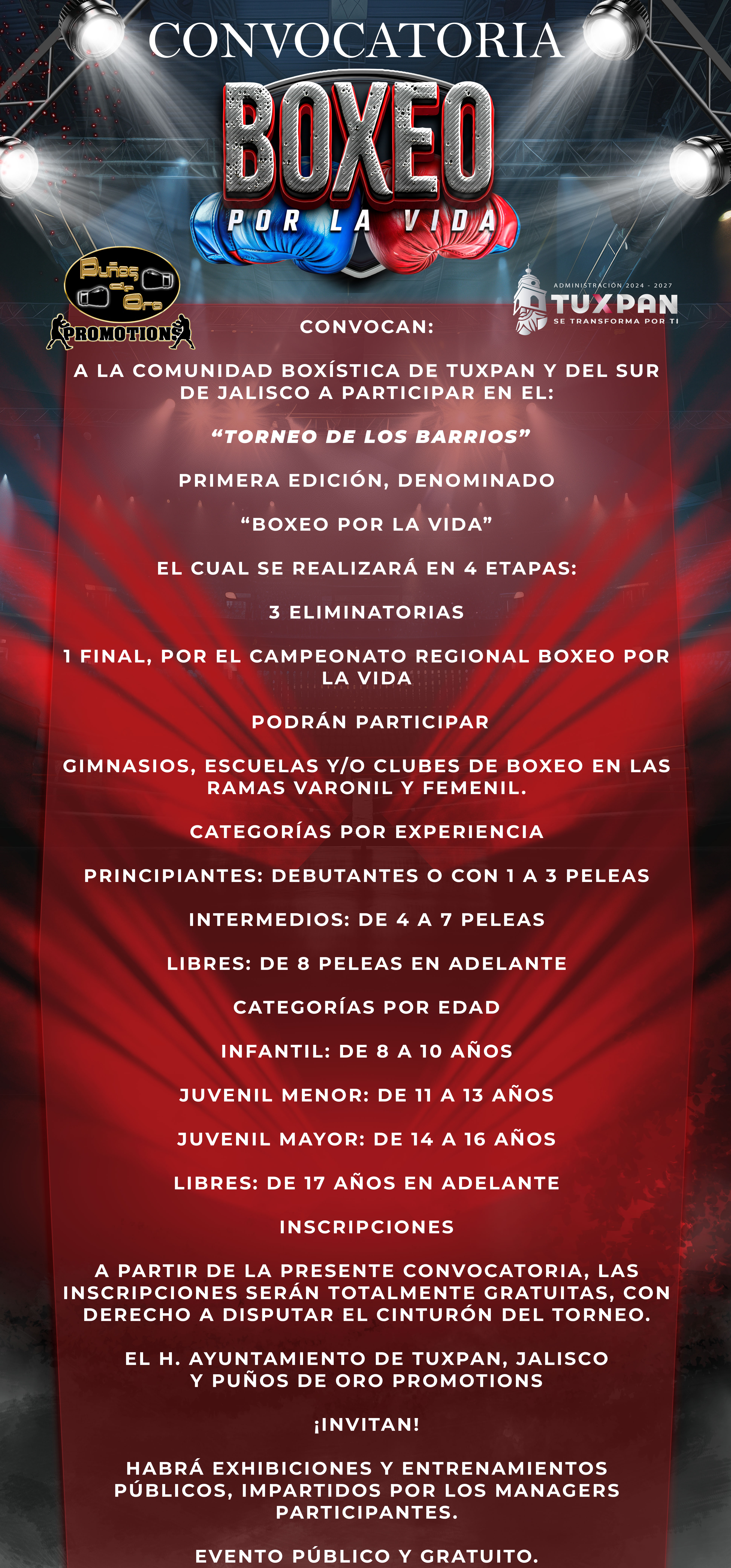 El H. Ayuntamiento de Tuxpan, Jalisco, a través de la Jefatura de Deportes, en coordinación con Puños de Oro Promotions, invitan a la comunidad boxística de Tuxpan y del sur de Jalisco a formar parte del:
