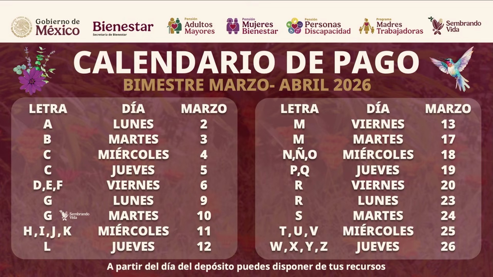 Revisa la imagen y ubica qué día te corresponde cobrar, de acuerdo con la letra inicial de tu primer apellido.