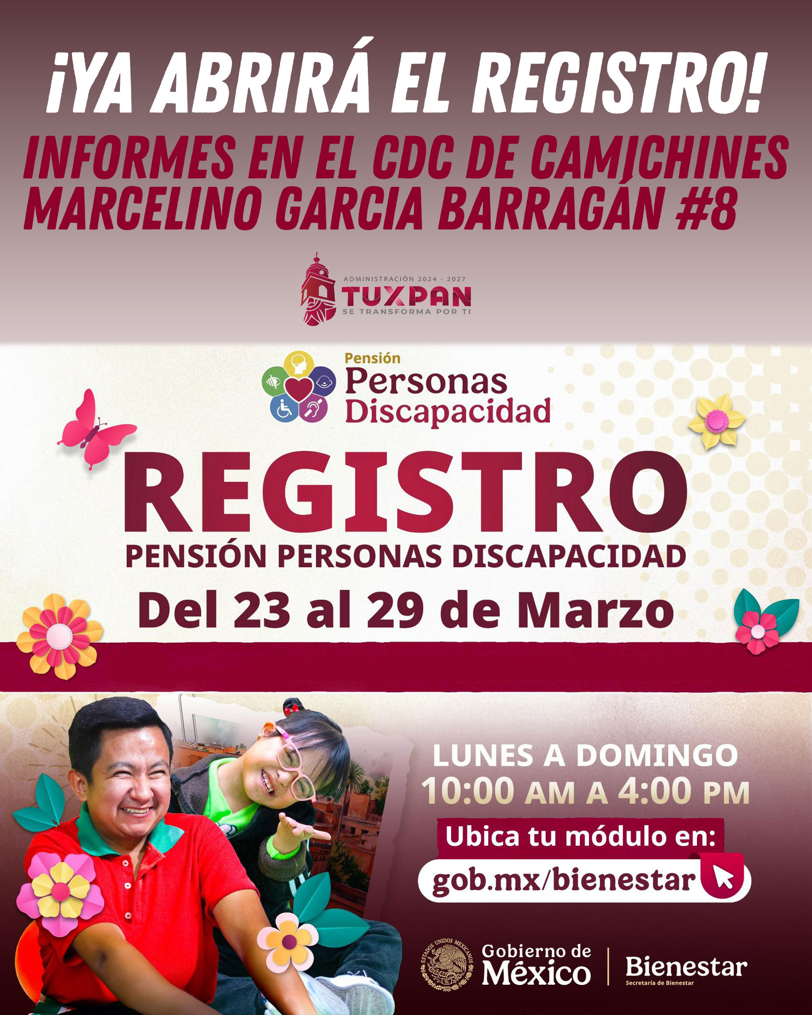 Invitamos a las personas con discapacidad a realizar su registro para la Pensión para Personas con Discapacidad. Del 23 al 29 de marzo Horario: Lunes a domingo de 10:00 AM a 4:00 PM Informes y registro en: CDC de Camichines