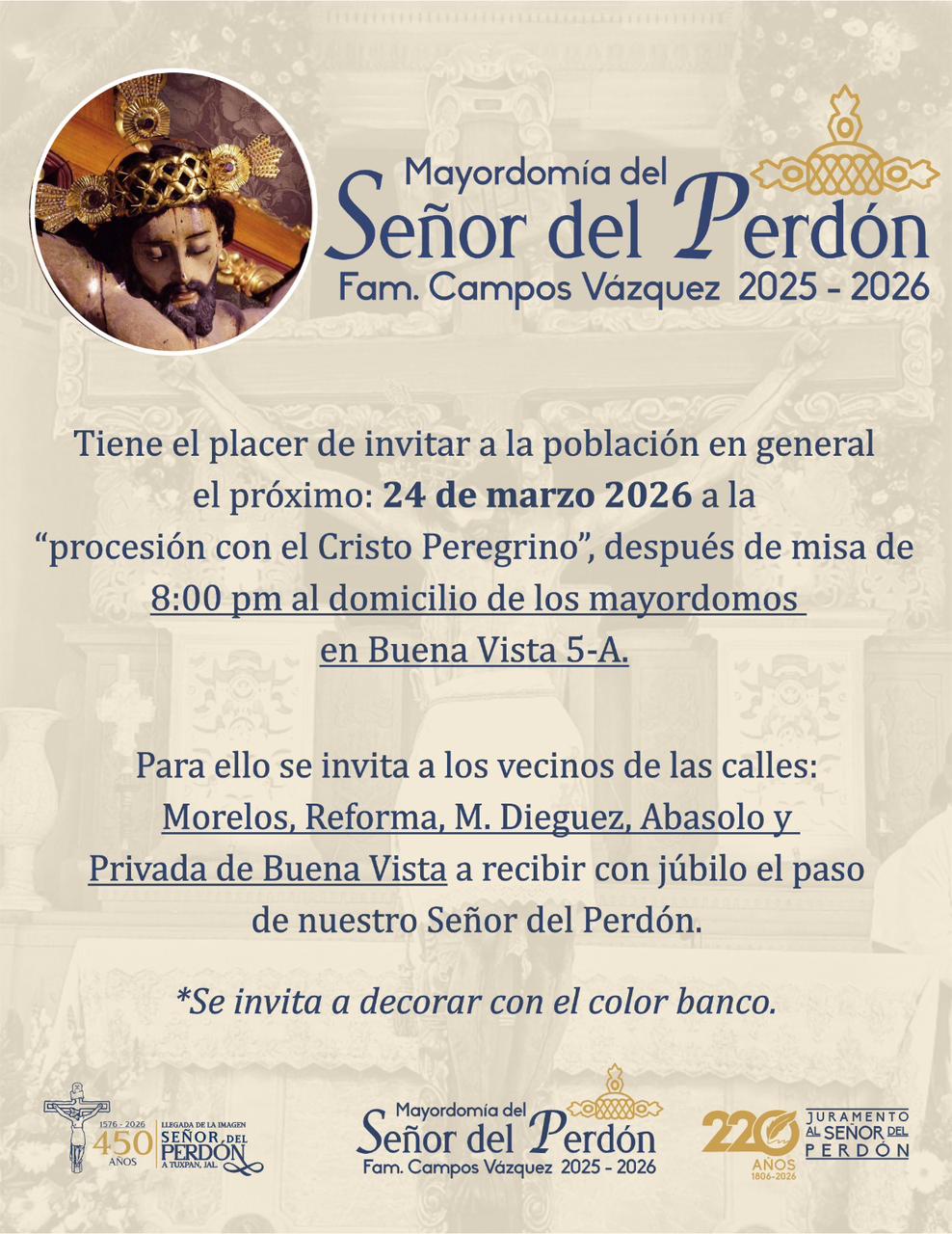 La Mayordomía del Señor del Perdón 2026, a cargo de la Familia Campos Vázquez, hace una atenta invitación a todas y todos los devotos así como a la población en general, a participar en las actividades programadas en honor al Señor del Perdón.